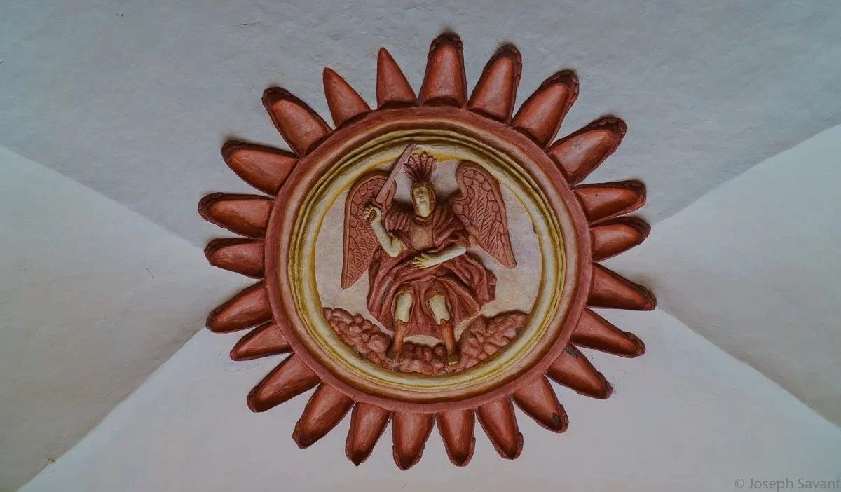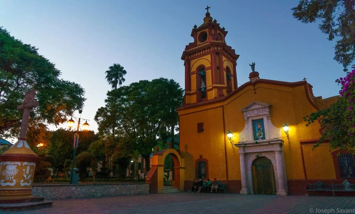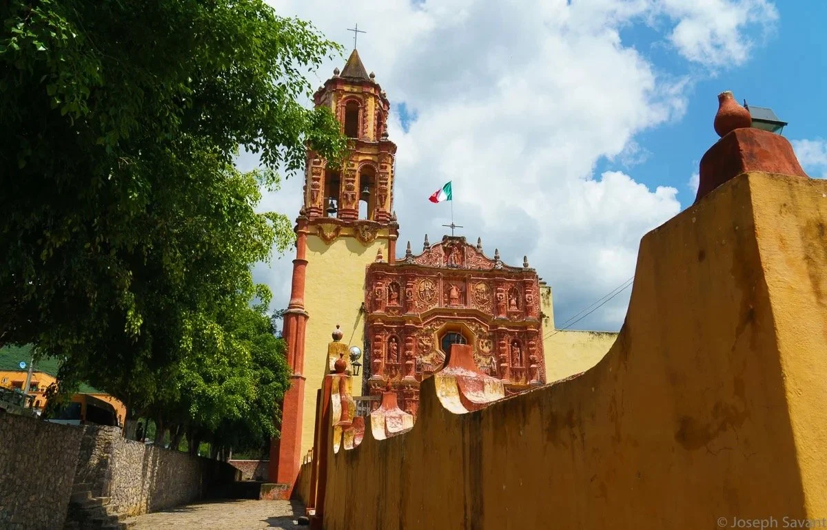 Xilitla lies on the eastern side of the Sierra Madre range, amid the tropical climate from the nearby Gulf of Mexico. As I traveled west, climbing higher to crest the Sierras, pines became common along with cooler temperatures. Little villages appeared on the steep hillsides, several with beautiful churches or missions, and I’d loop around the plazas to see them. The most impressive was the church facade in the town of Landa Matamores, where I pulled up to park and found myself next to a man and his little boy on the sidewalk.