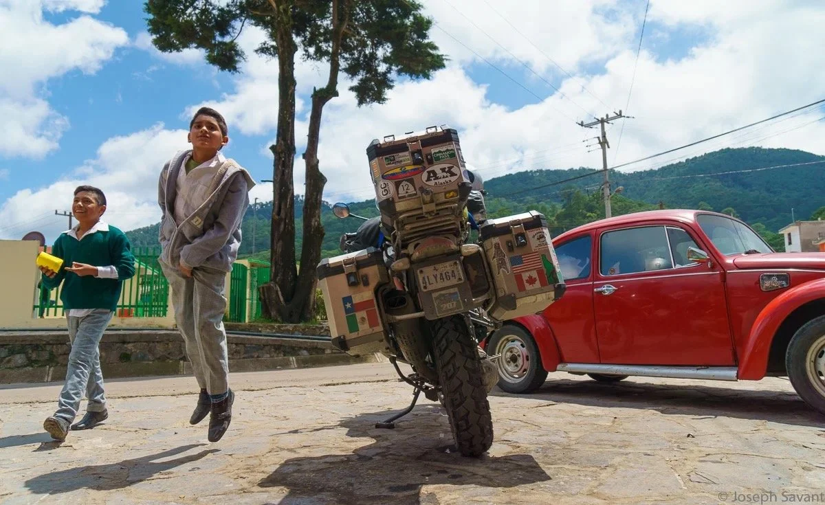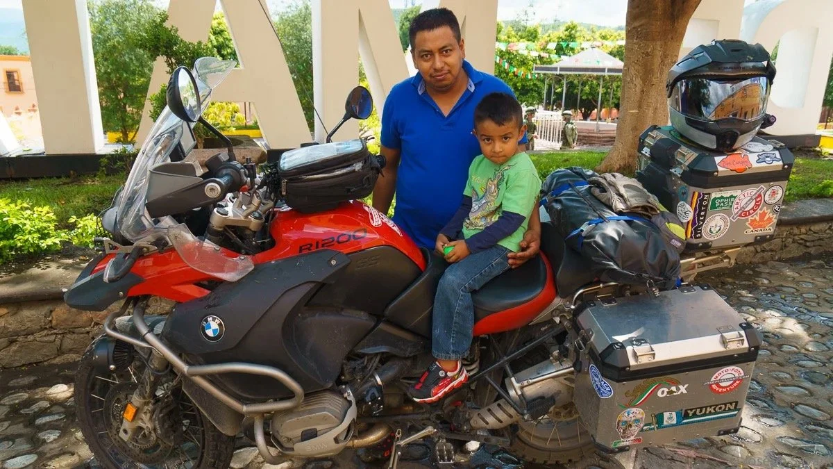 Upon my return, Santiago and little Manuelito were gone. I figured they would return and waited. Ten minutes turned into twenty. I saw him running back to me, showing me his car key and indicating it wouldn’t start. He ran away again and about 15 minutes passed before I saw him and his family returning. They stood aways off, almost as if afraid to approach. When I waved they excitedly ran to the bike for pictures. I shot a couple of family photos with the bike on their phone. It was sweet, as they had obviously gone home and changed clothes for the photographs. When we finished, a man came out of the government building to hand me a brochure of the town. He was genuinely friendly and happy to see me, shaking my hand and nodding with a big smile.