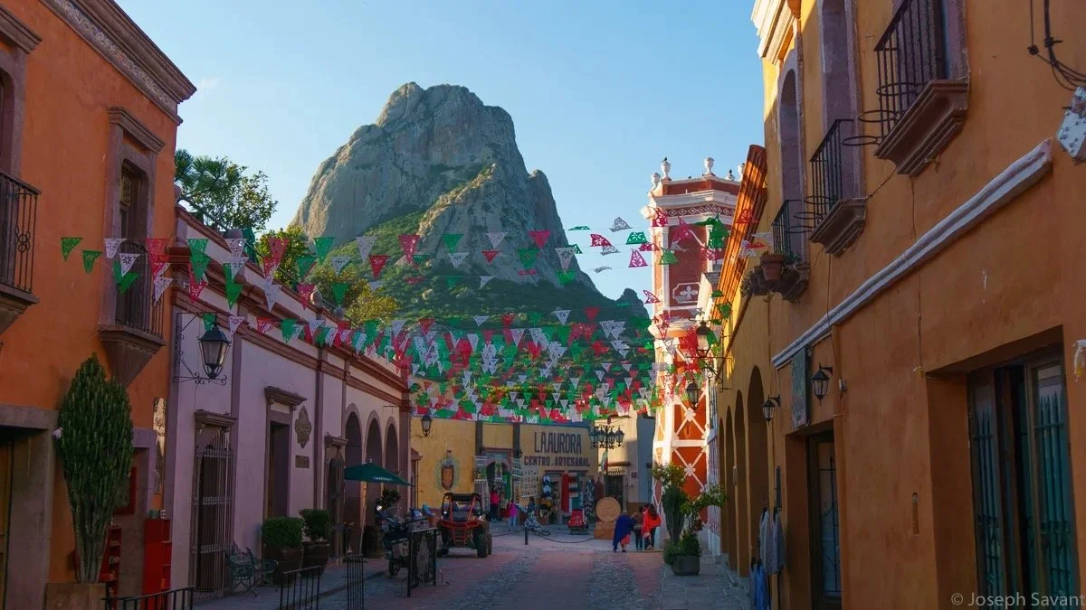 Bernal sits beneath a huge stone outcropping. It is a small, quiet town of simple yet colorful buildings not too far from the bustling city of Queretaro to the west.