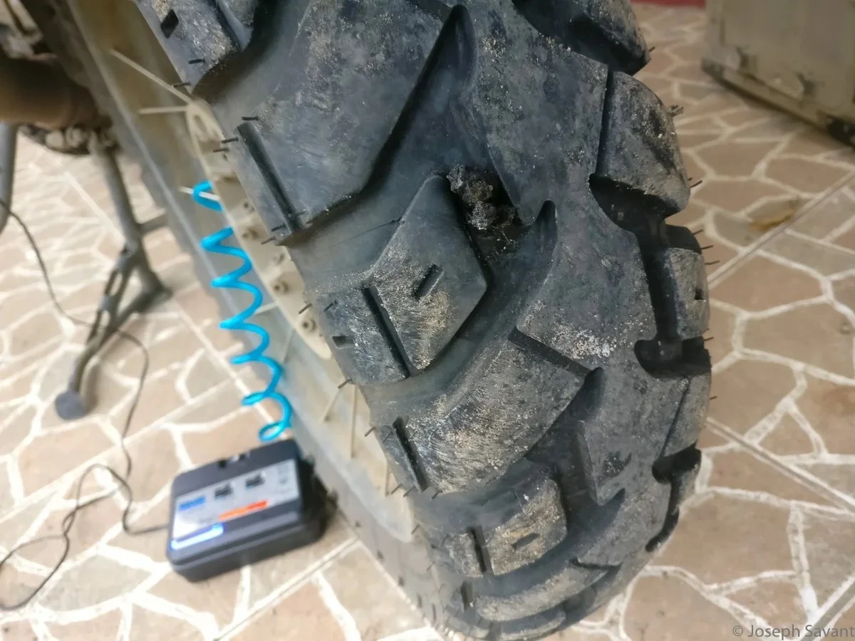 Approaching blacktop, I heard a loud backfire from the bike and proceeded back to town behind him. He pulled over and pointed to a blacktop road, saying “derecho, izquierda, izquierda”. I shook his hand and thanked him and as I pulled away noticed the bike felt a bit odd. It was beginning to rain and I pulled over about 50 yards down the road to check the bike and sure enough the rear was flat. The loud bang had been the puncture and not a backfire. There happened to be an abandoned building with a covered porch area and I got the bike down onto it. Removed the cases and heaved the bike onto the center stand where I found a pinkie finger sized puncture.