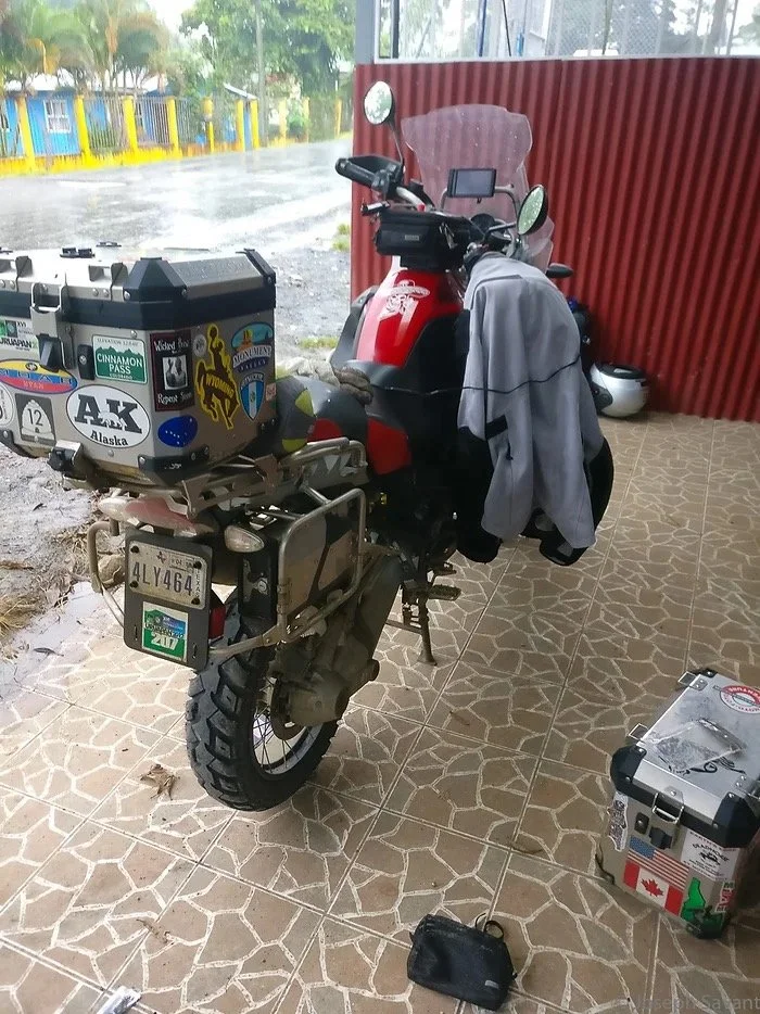 By this time I was beat as I went back in the rain and up the hill to the Aduana. I gave him everything and he looked it all over very slowly then handed it back and pointed back to the Panama Immigration building. Once again in the rain and into the office, the now disgusted immigration officer took his time but eventually handed me back more paperwork and pointed to the Aduana. Back through the rain to the building and I was excited because I knew the final portion was almost done. Except there was a problem with my paperwork, the title wasn’t enough or he wasn’t sure of the bike color or God knows what. I didn’t know what to do, but the only piece of paper I had left was my registration that was still safely tucked away in my pannier. On the bike. Up the hill. In the rain.